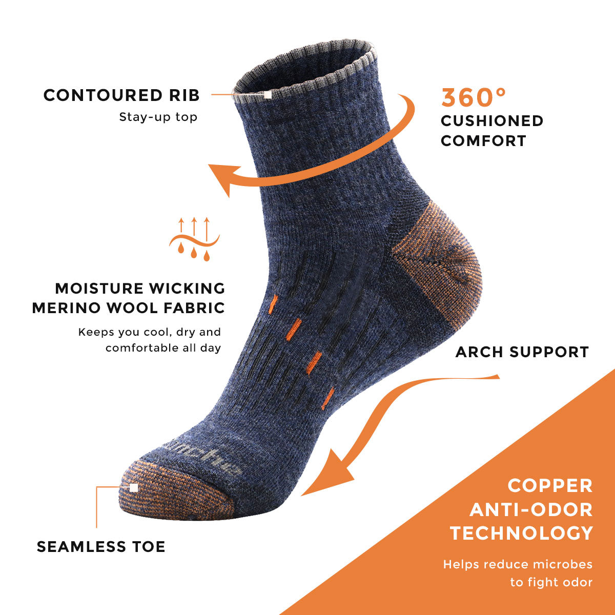 Made with merino blend wool and copper yarns to provide odor resistant function to keep your feet feeling fresh