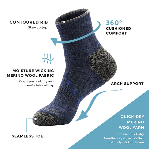 Constructed with a cushioned, moisture wicking Merino wool fabric, our Quick Dry Merino Quarter Crew Socks are built to keep you comfortable all day long. These breathable quarter socks have a seamless toe bed to prevent irritation, and the cushioned foot bed with arch support will keep you moving with ease through your hike, workout or day to day activities. Package includes two pairs of men's quarter crew cut socks.