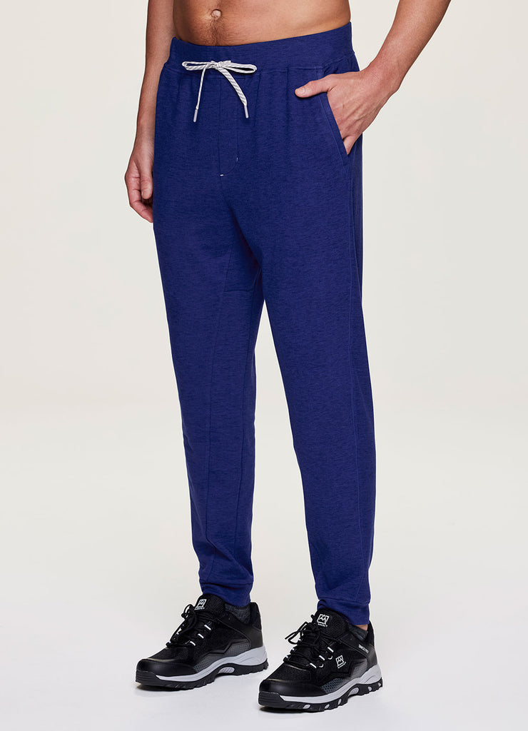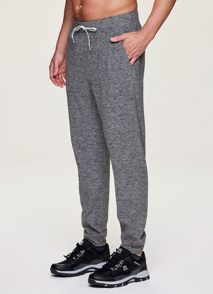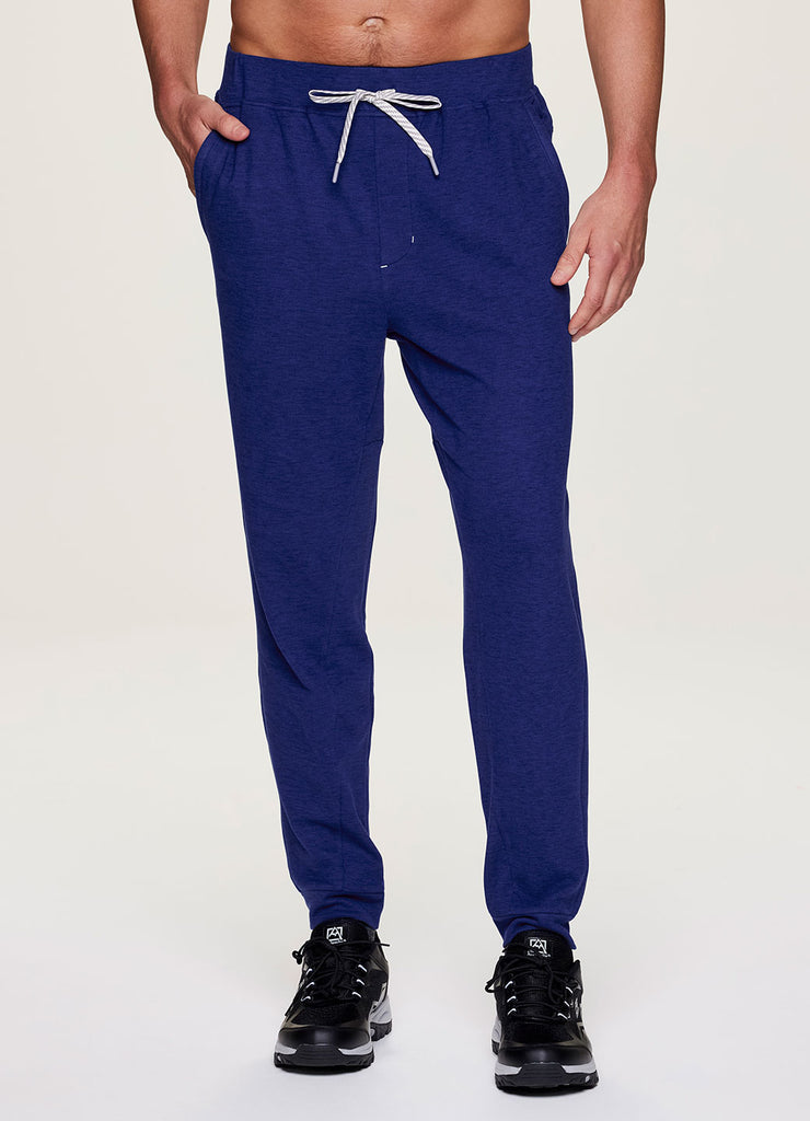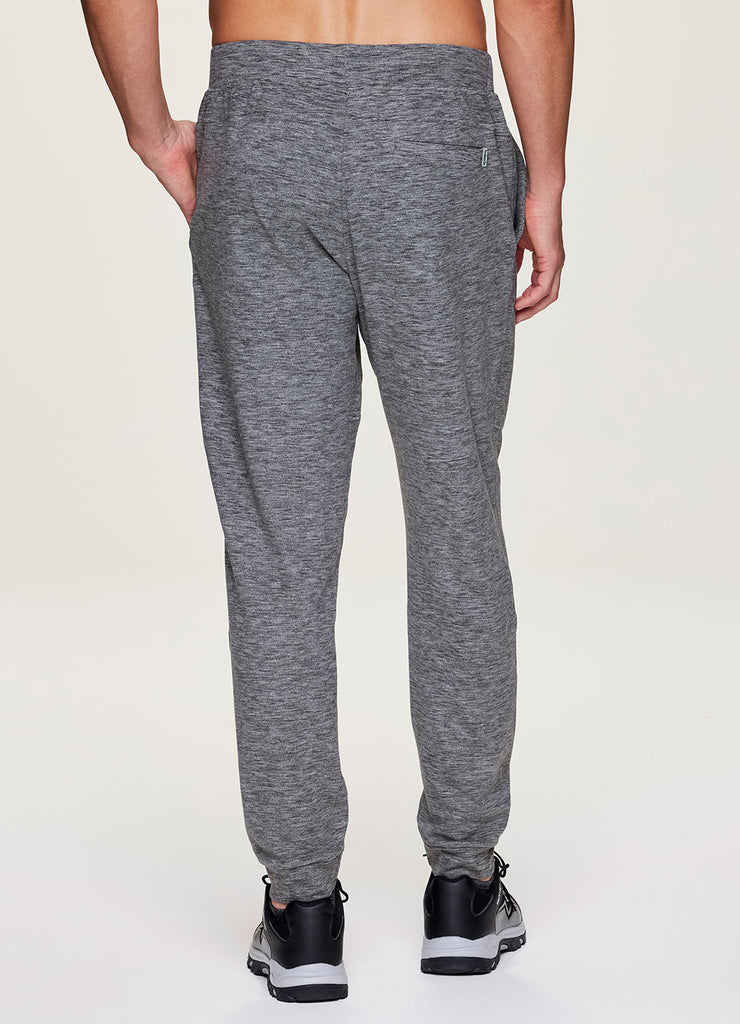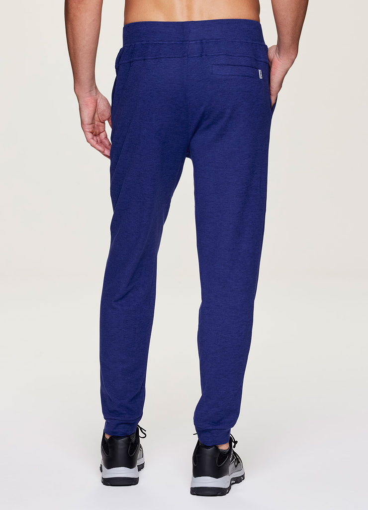 Tapered leg jogger design with ankle cuffs and faux fly detail