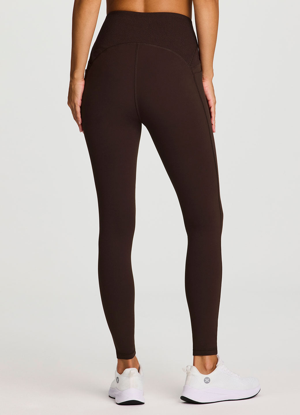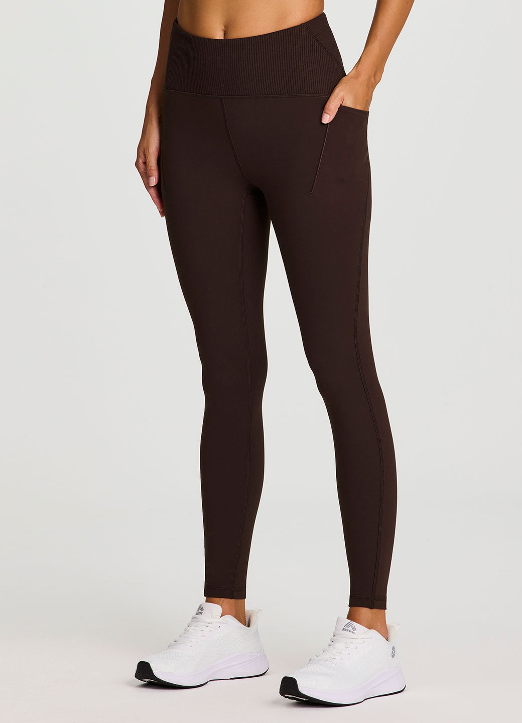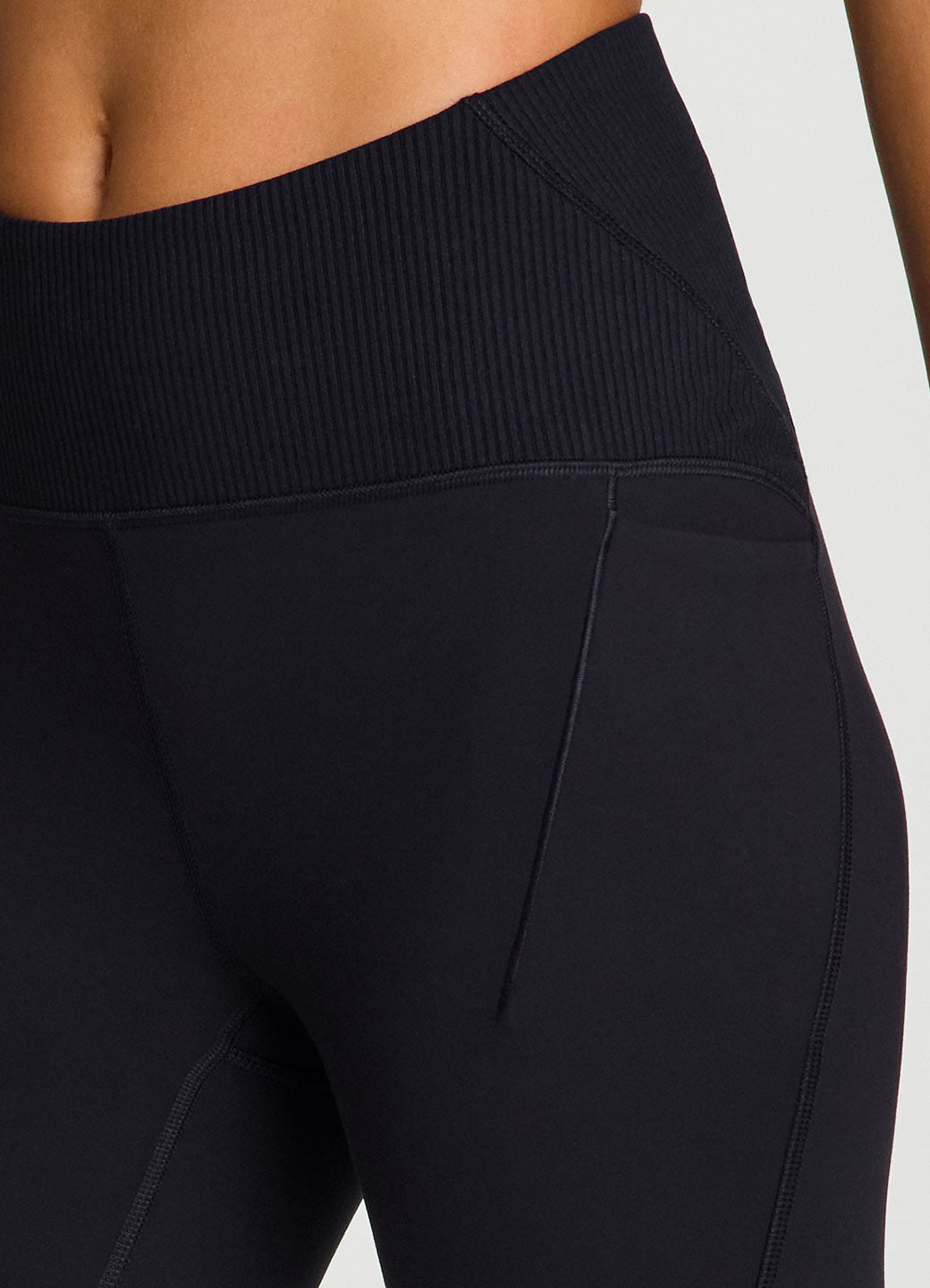High rise design with a ribbed waistband and sporty seaming detail throughout