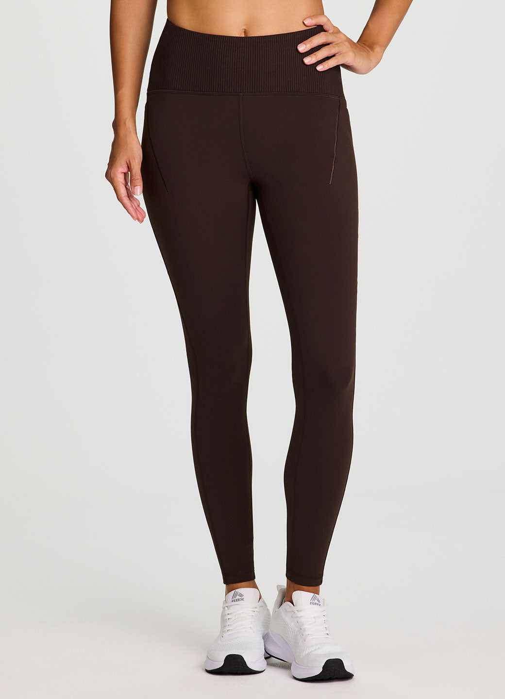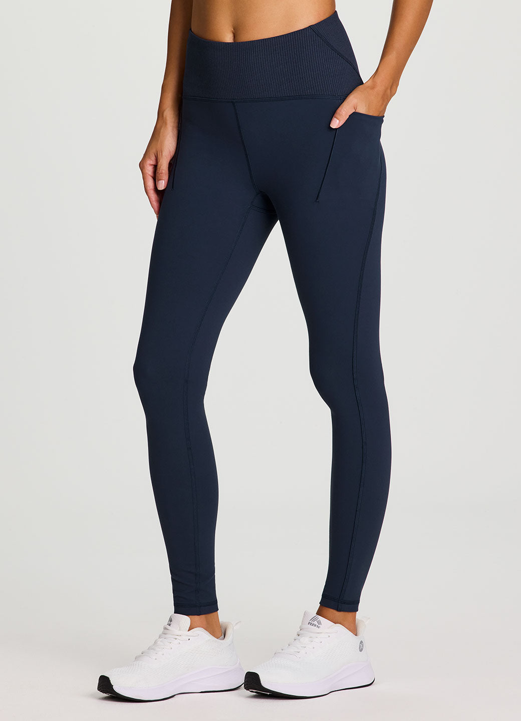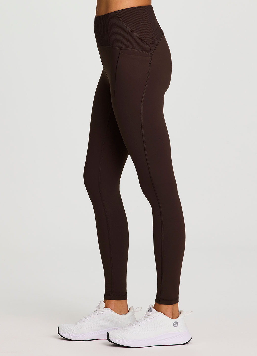 High rise design with a ribbed waistband and sporty seaming detail throughout