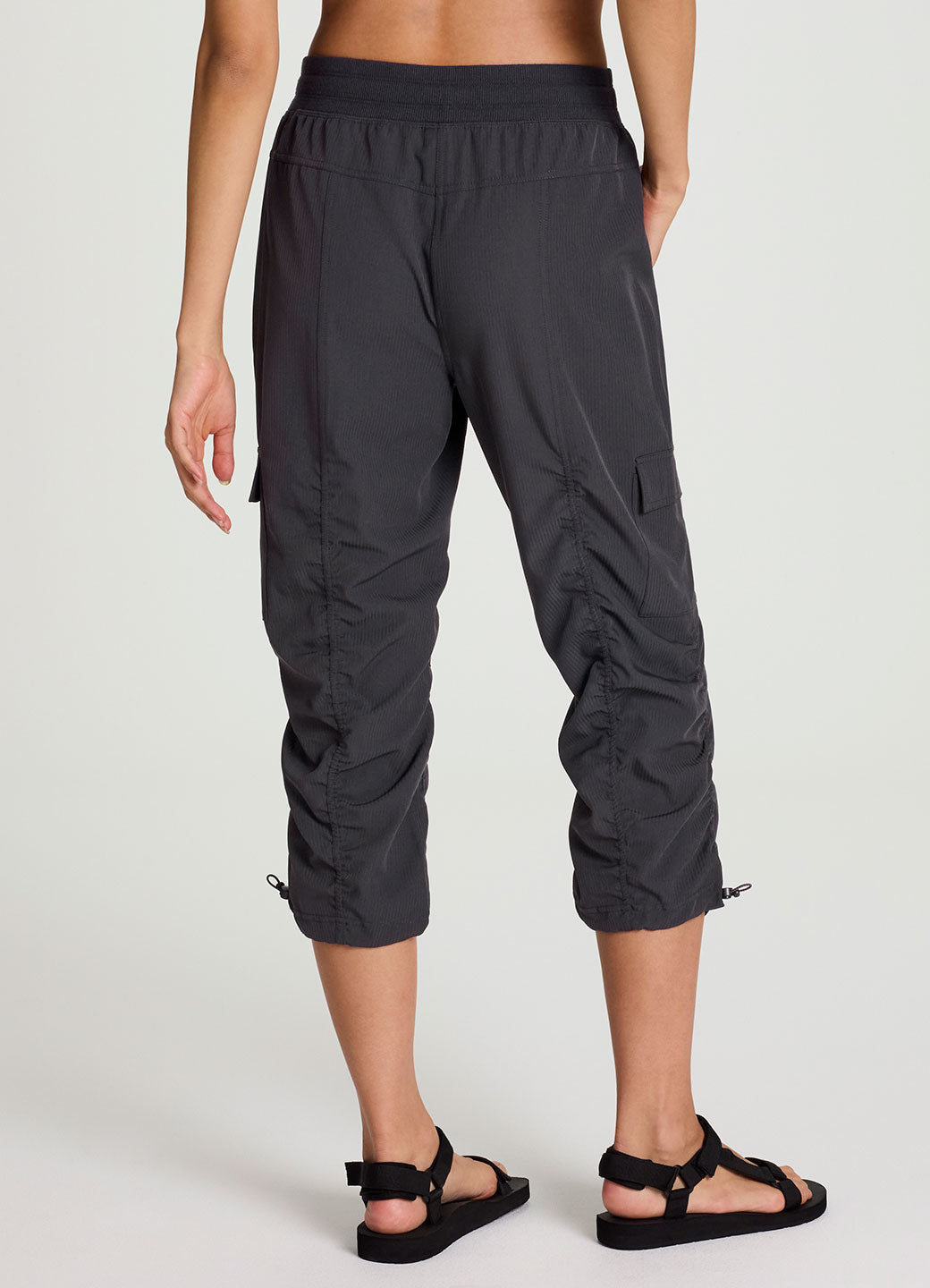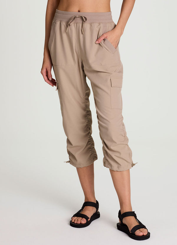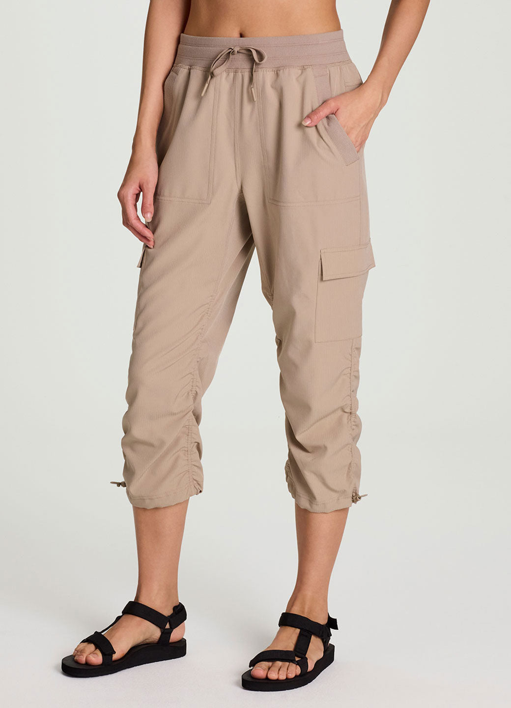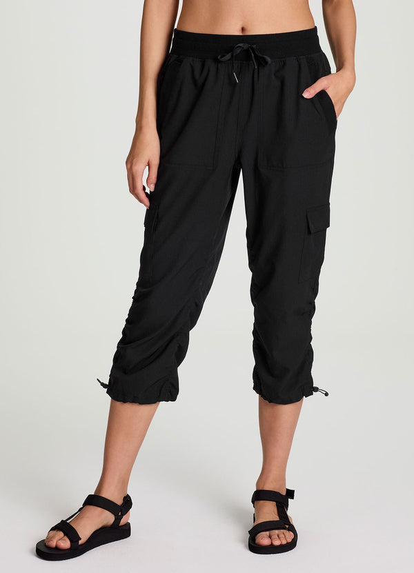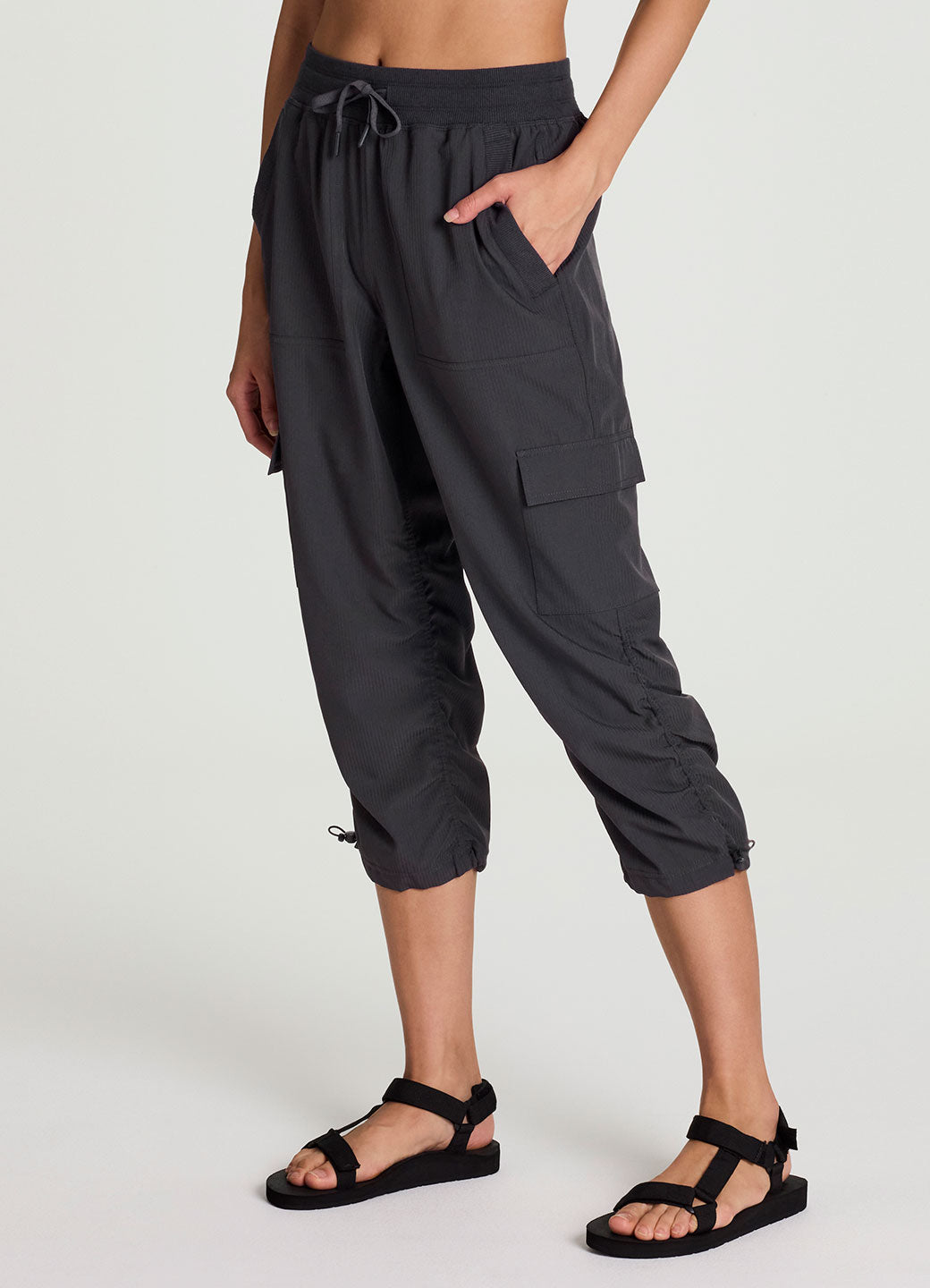 Designed with functional versatility in mind, our Valley Cargo Capri Pant features side pockets and cargo style pockets to store all of your essentials, while an adjustable waistband and leg opening allow for a more customized and secure fit. The lightweight, quick-drying stretch woven fabric features a subtle shadow stripe effect to elevate your look, plus it's designed to dry quickly to keep you comfortable during any activity from hikes or vacation adventures to everyday errands around town. Finished with flattering leg shirring and seaming detail that's easy to style for any occasion.