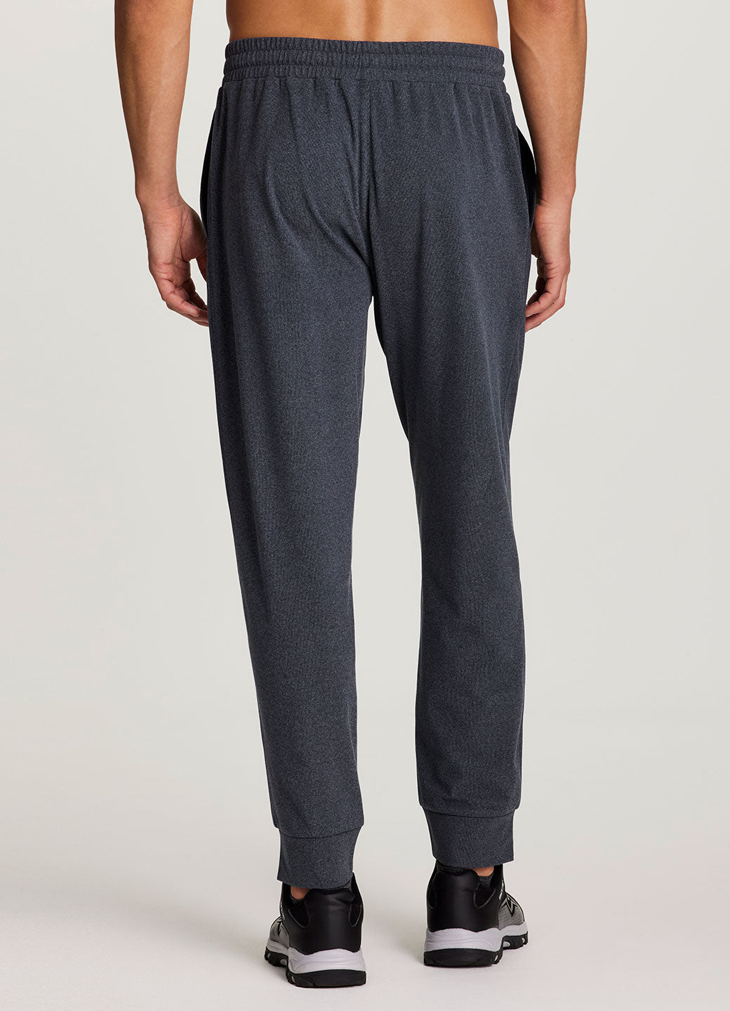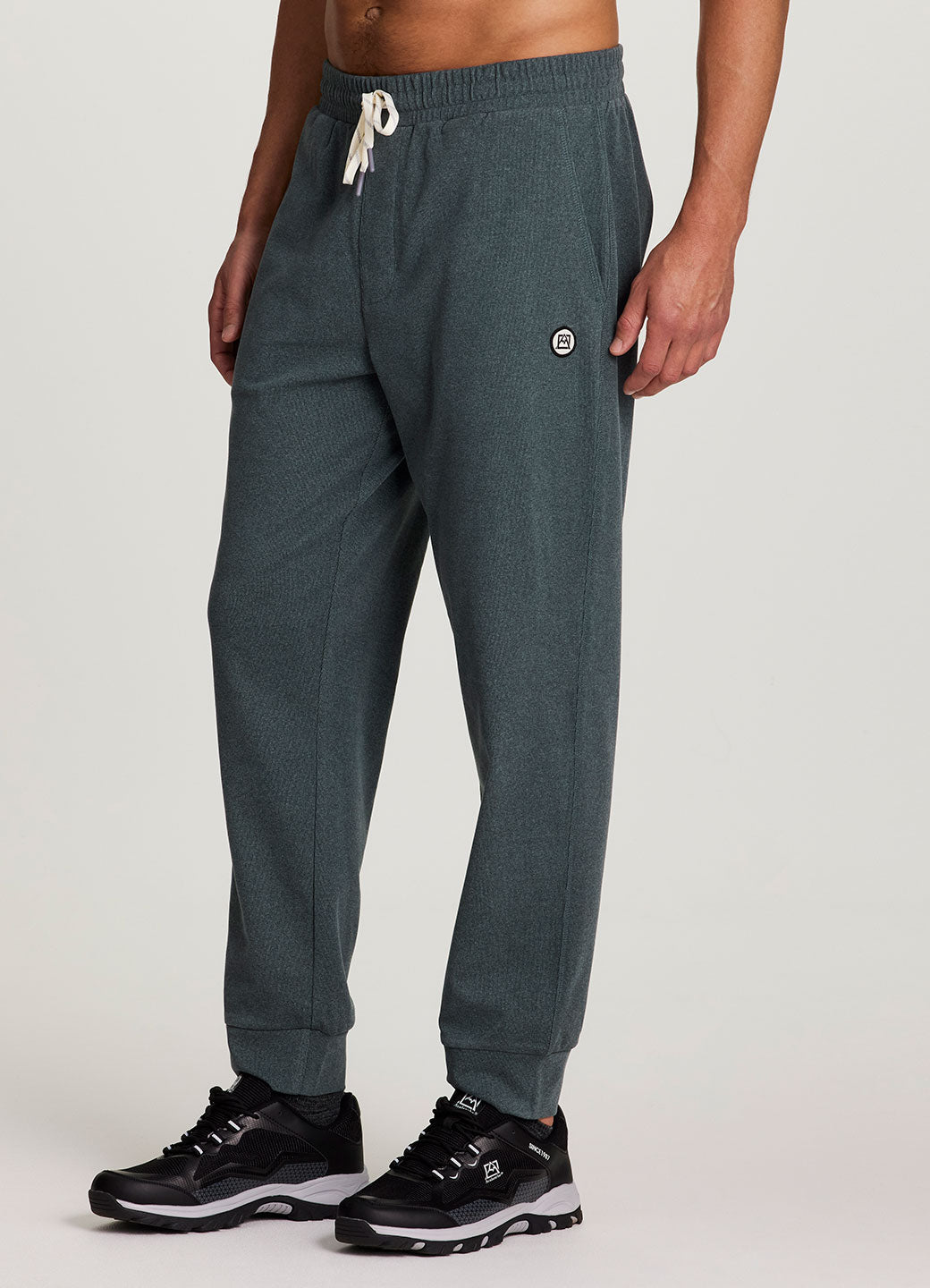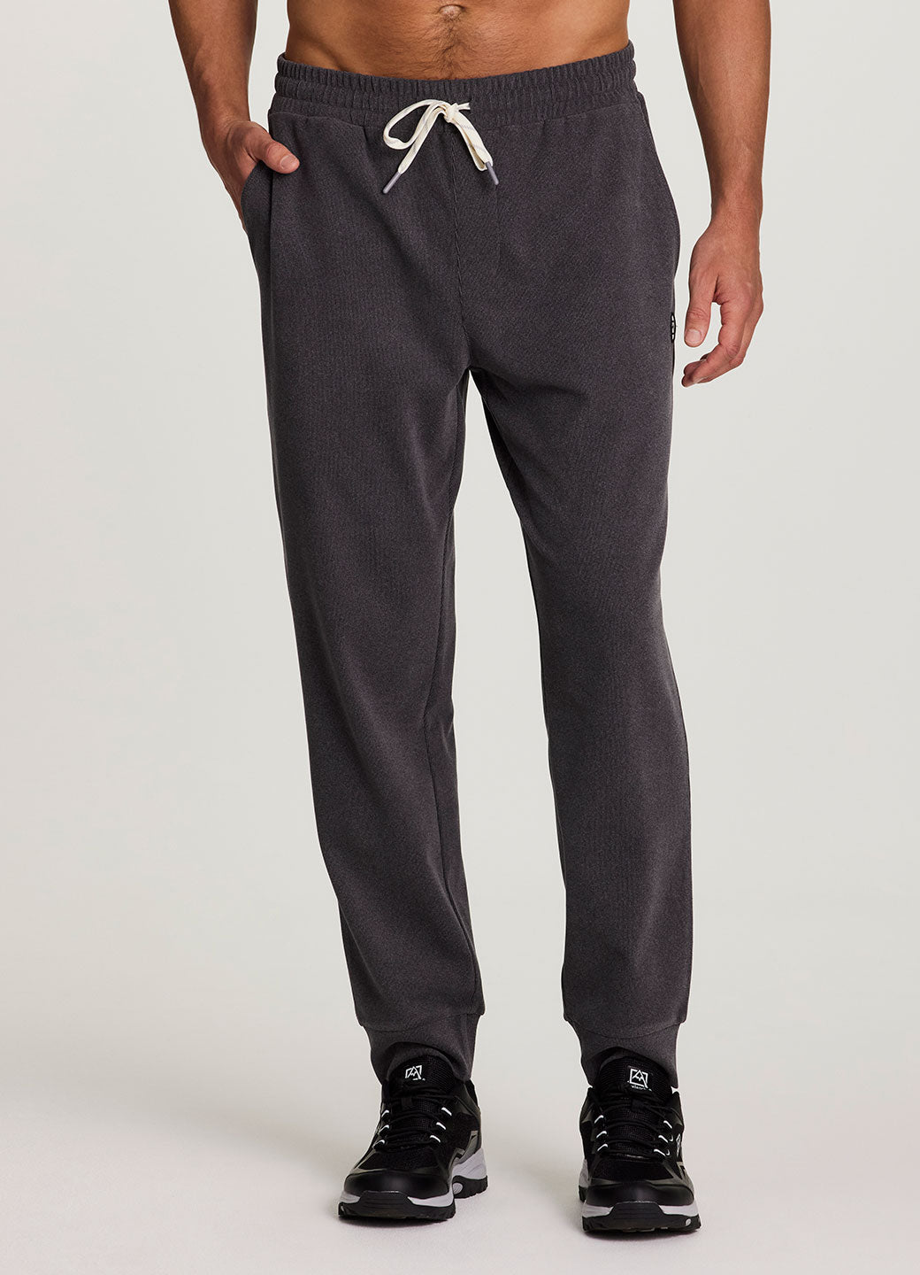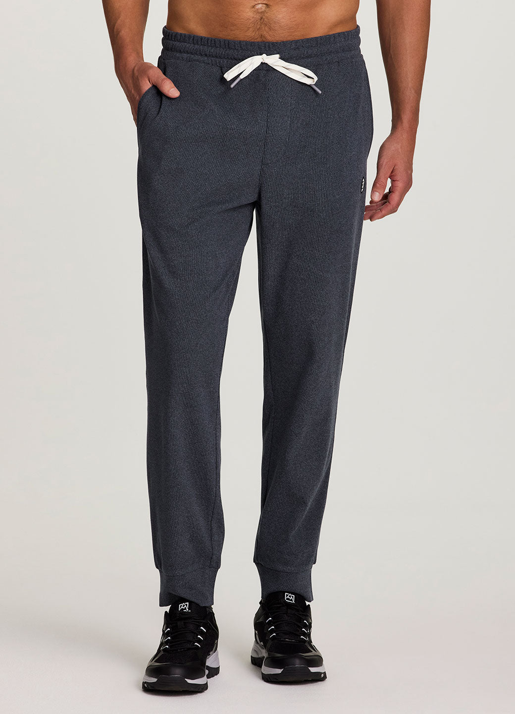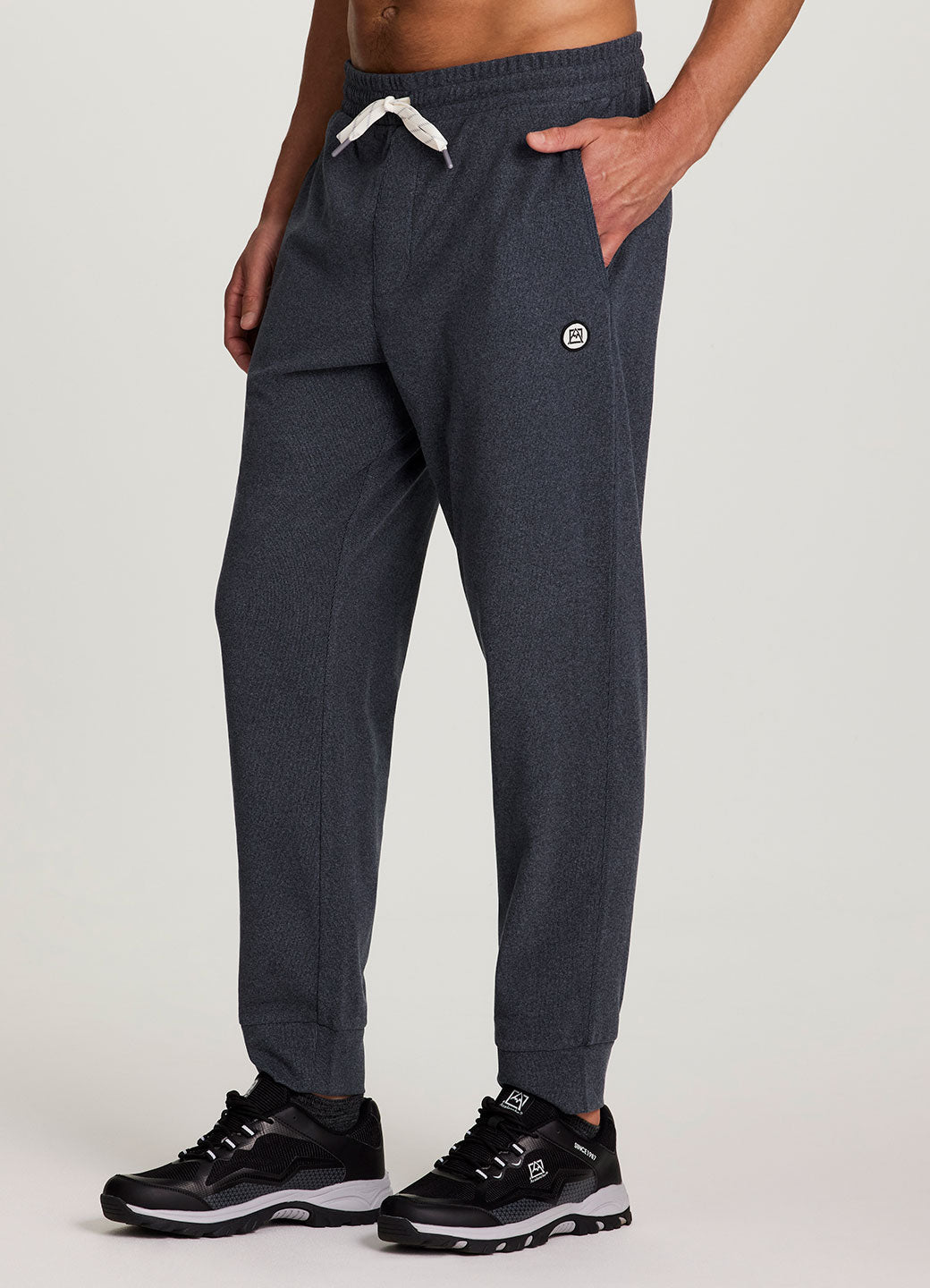 Traditional tapered leg jogger design with ankle cuffs and faux fly detail
