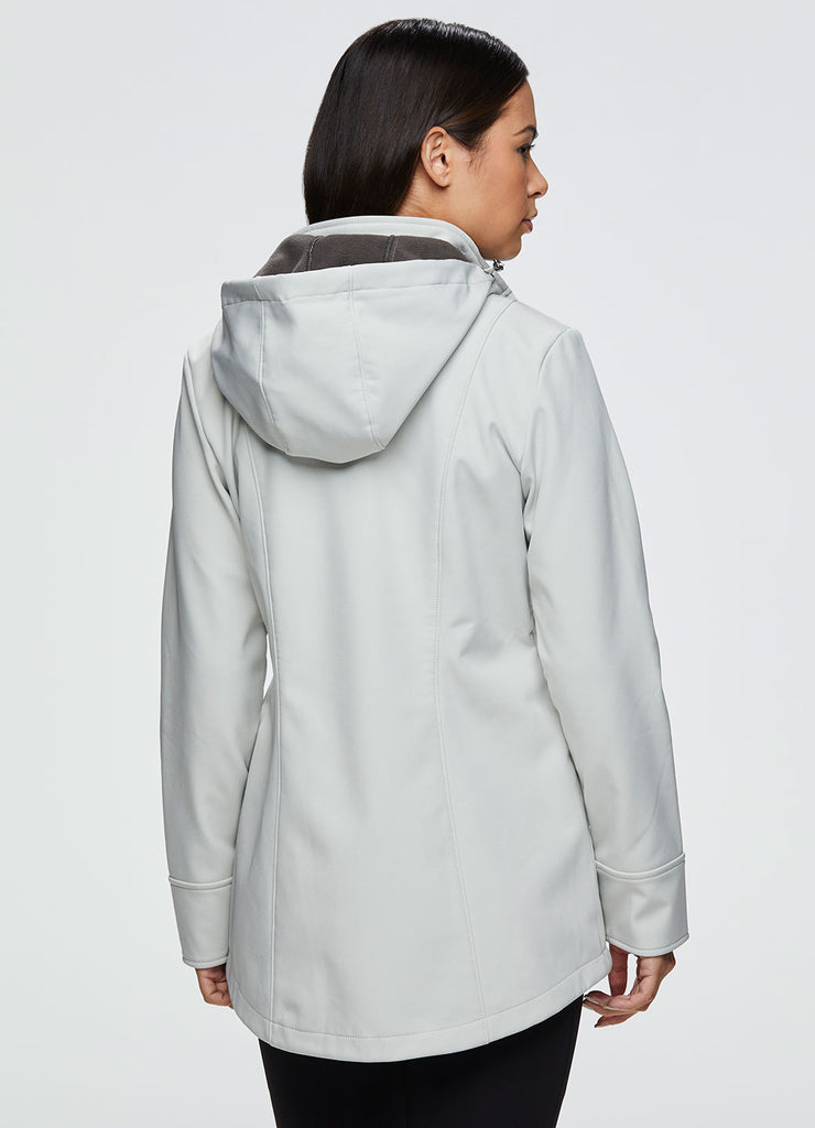 Features an attached fleece-lined hood with adjustable drawstring toggles