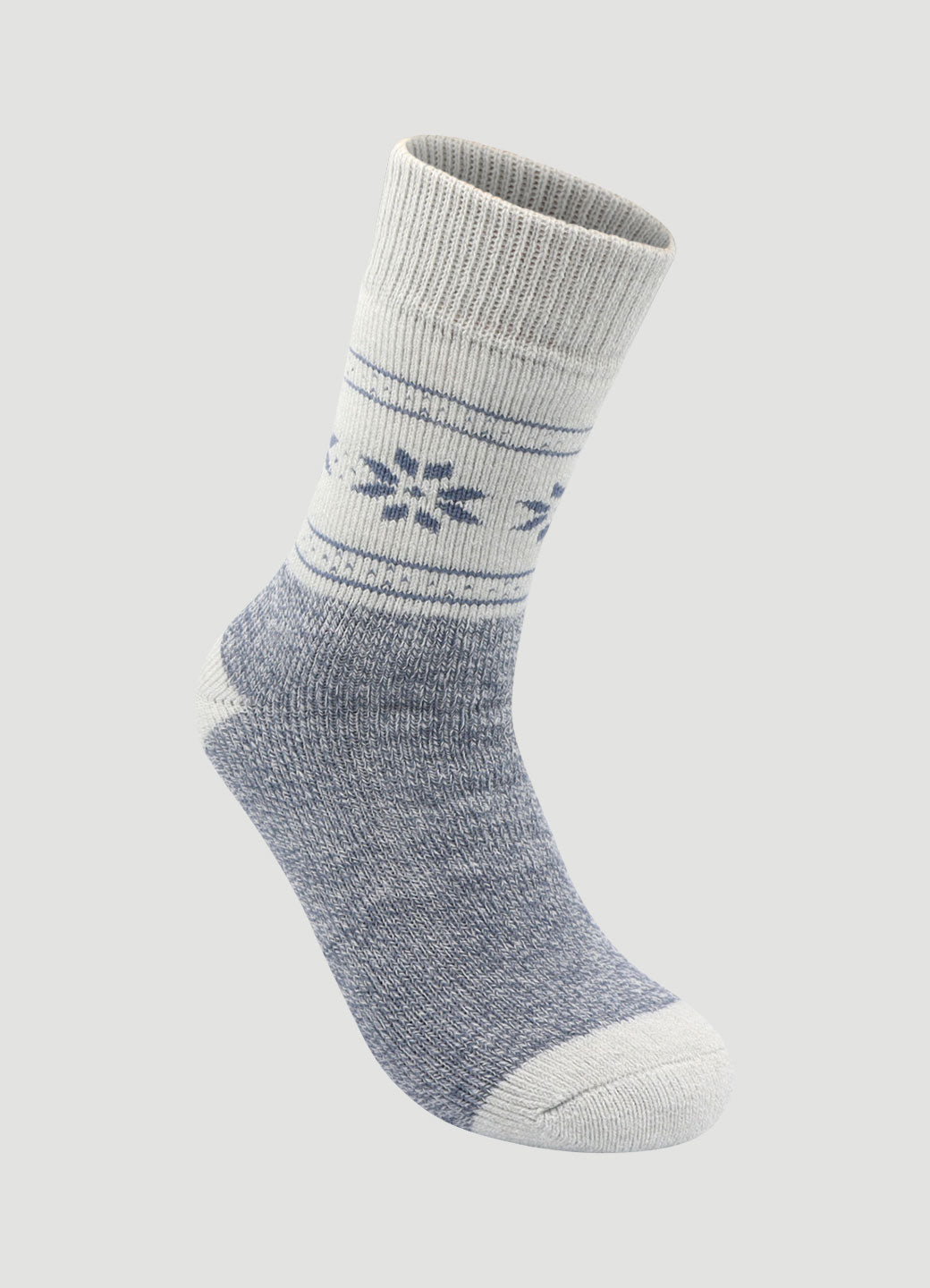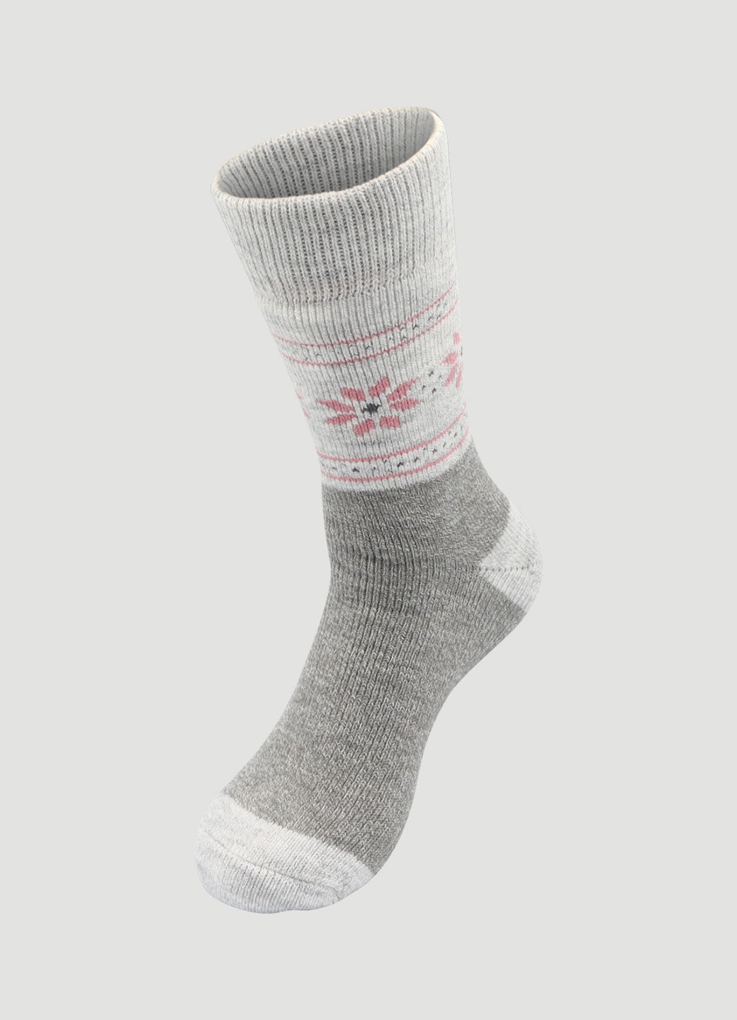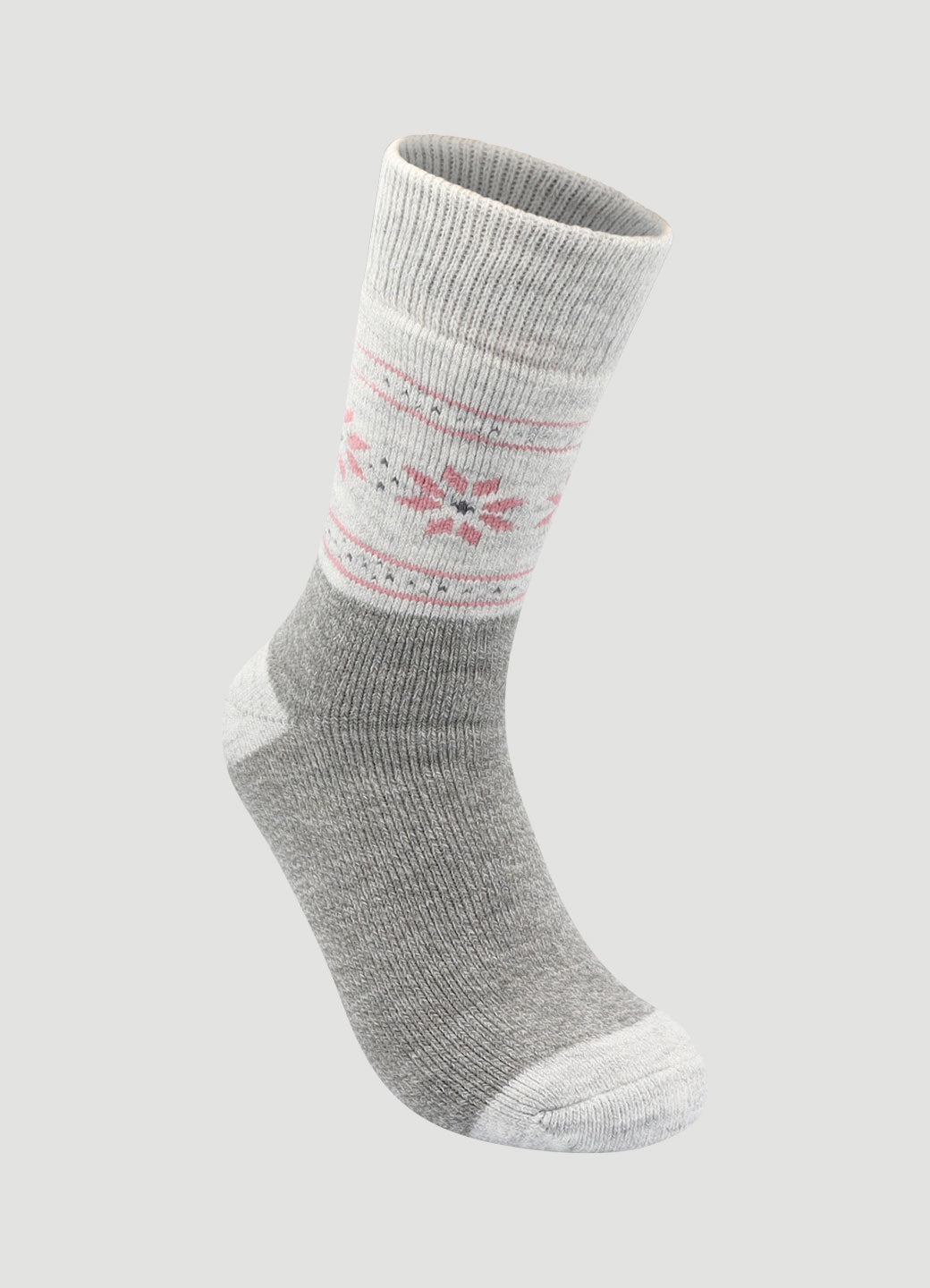 Package includes one (1) pair of thermal crew socks with festive pattern detail fitting women's shoe sizes 5 to 9.5