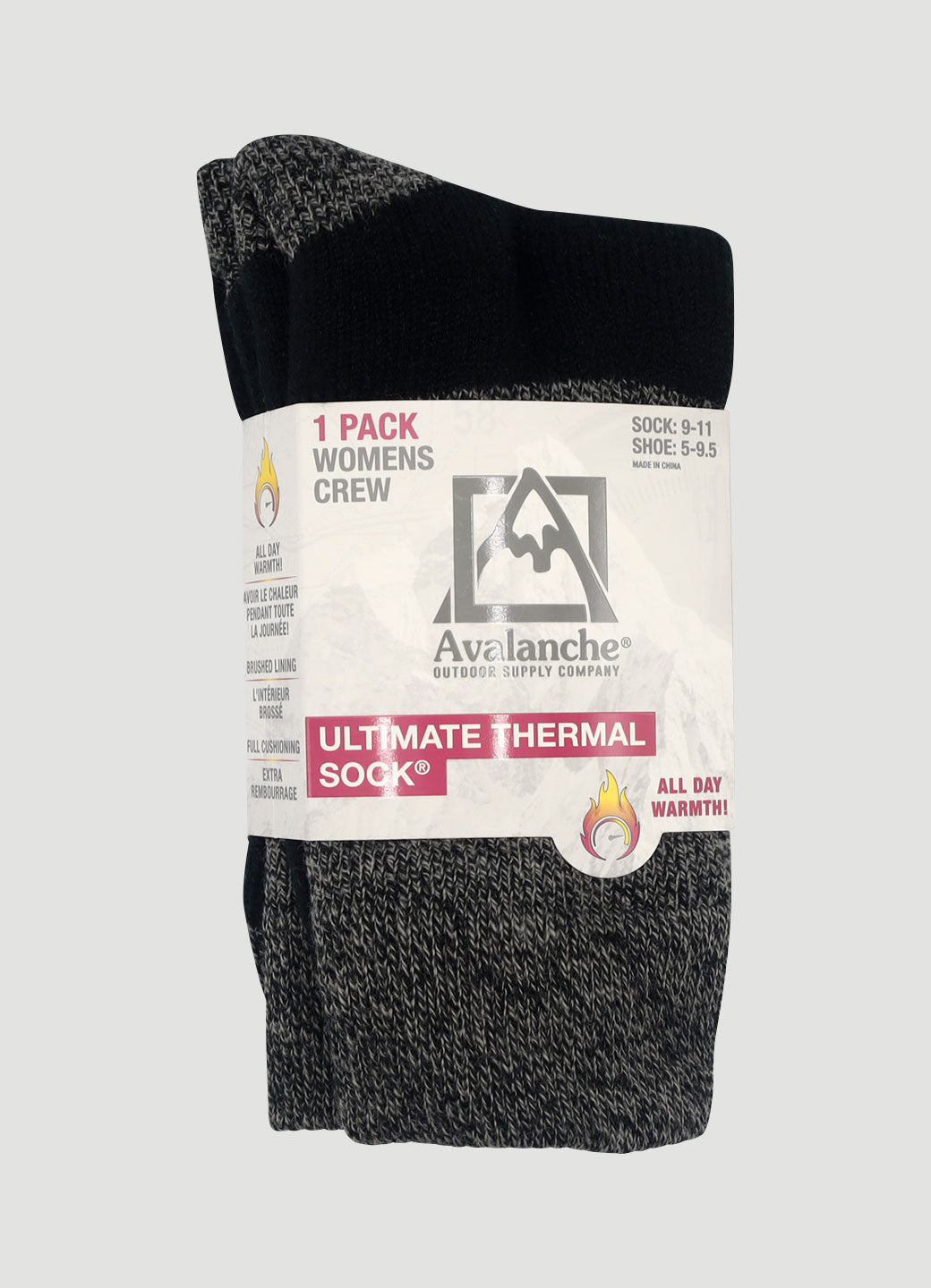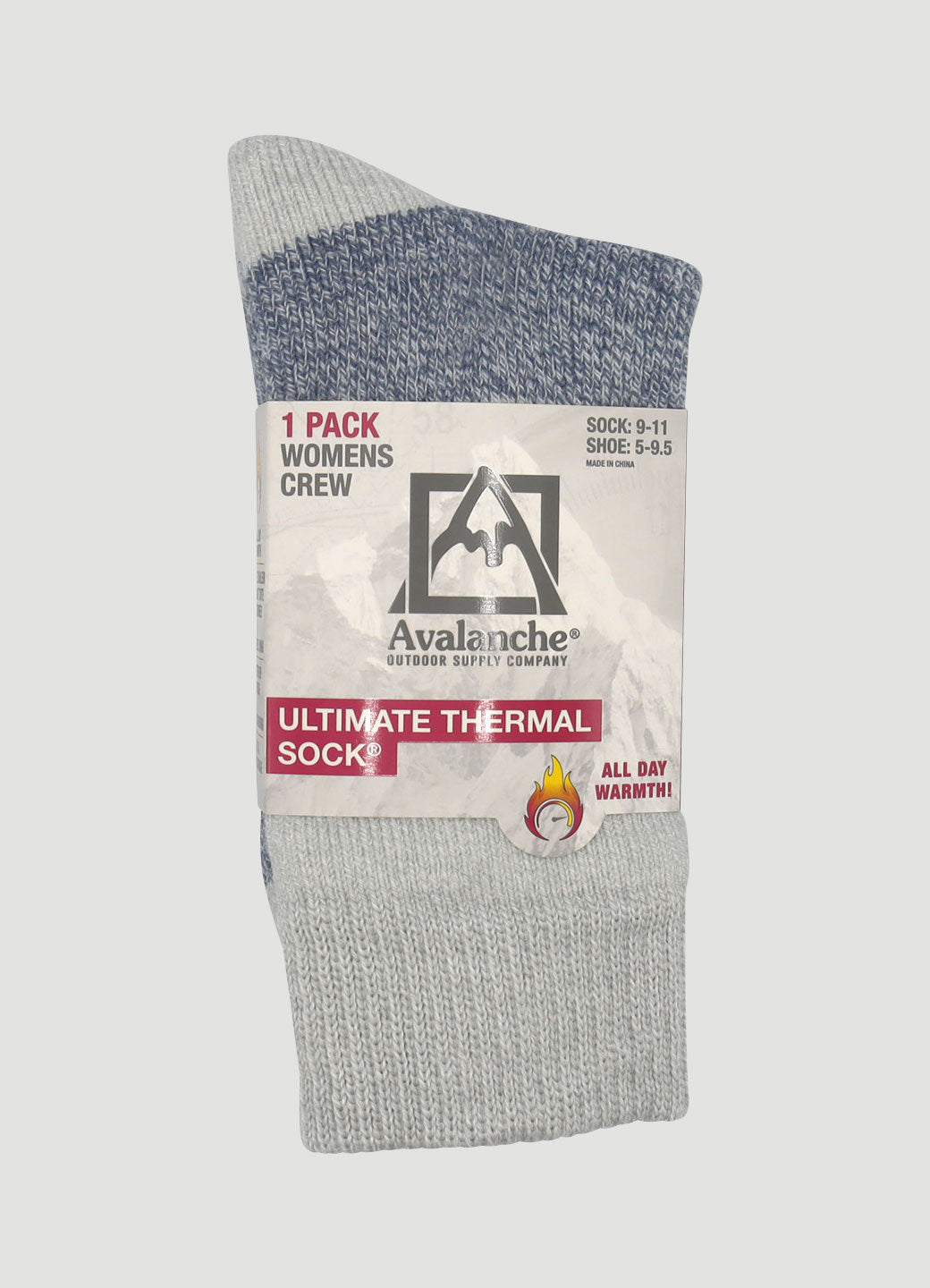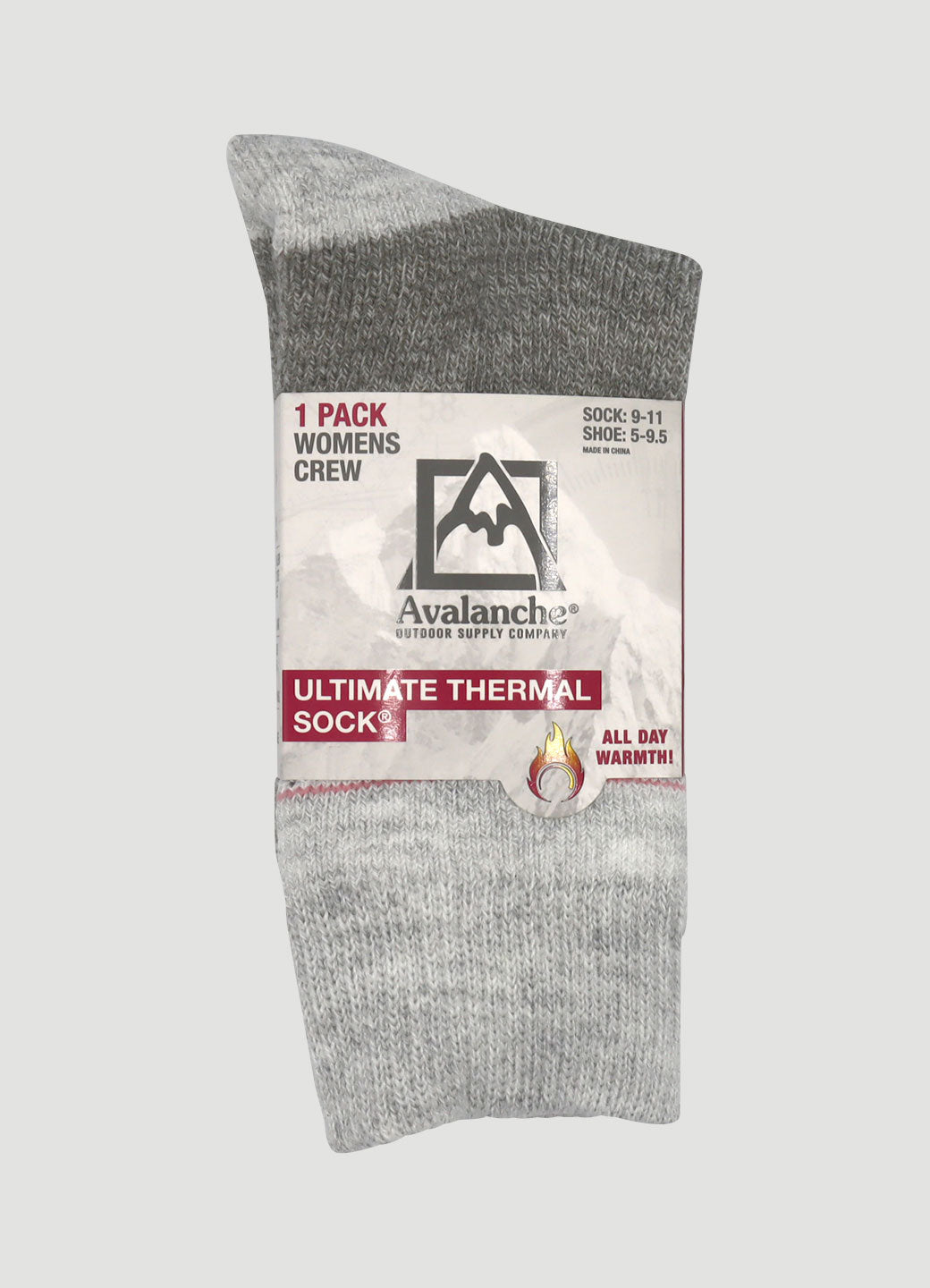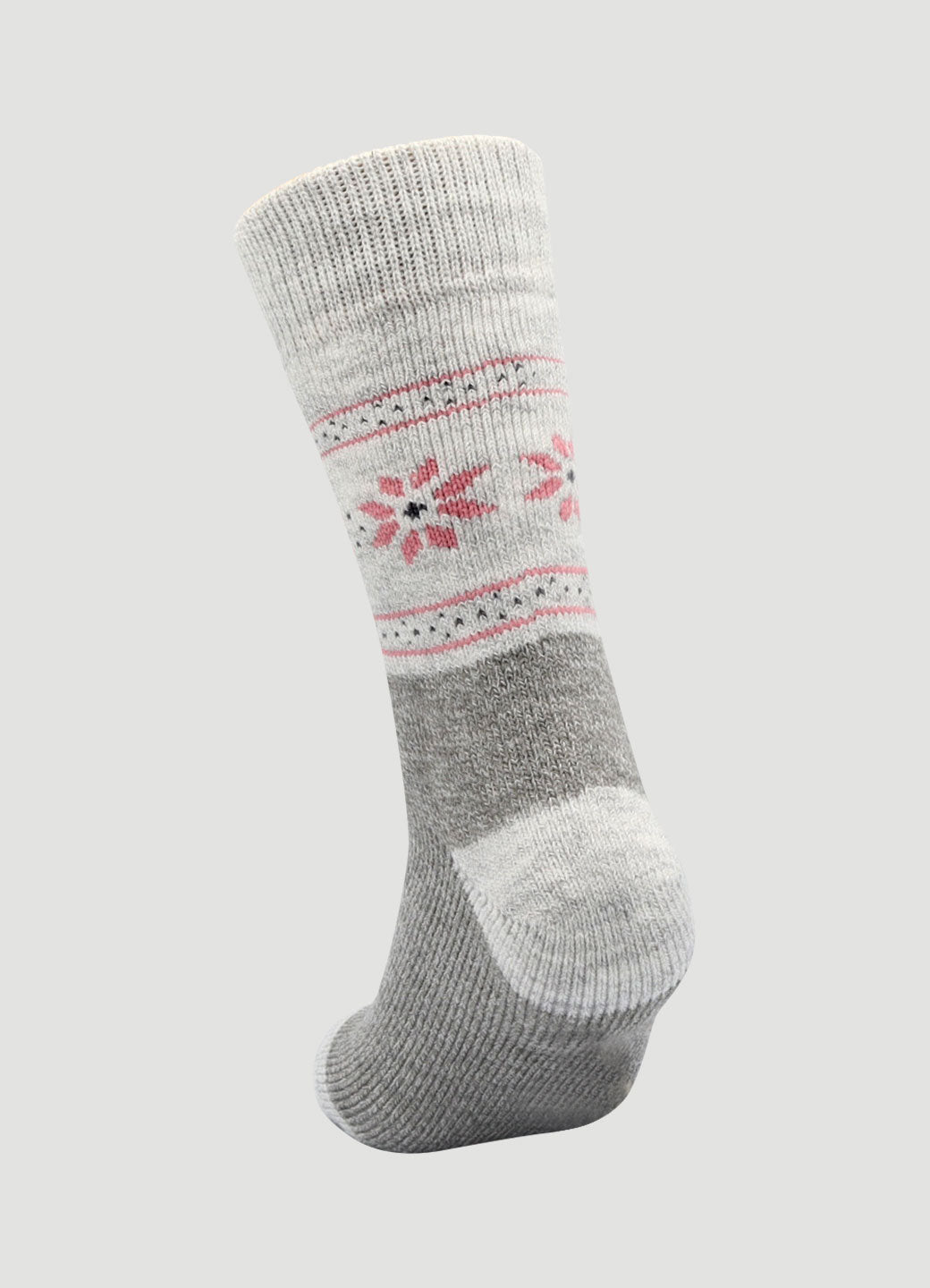 Package includes one (1) pair of thermal crew socks with festive pattern detail fitting women's shoe sizes 5 to 9.5